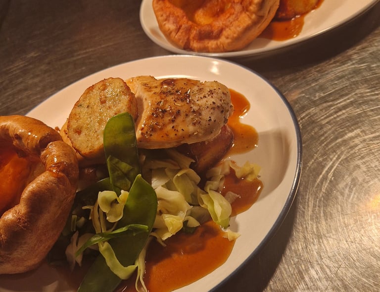 All main dishes are accompanied by roasted potatoes, a selection of seasonal vegetables, cauliflower cheese and gravy.